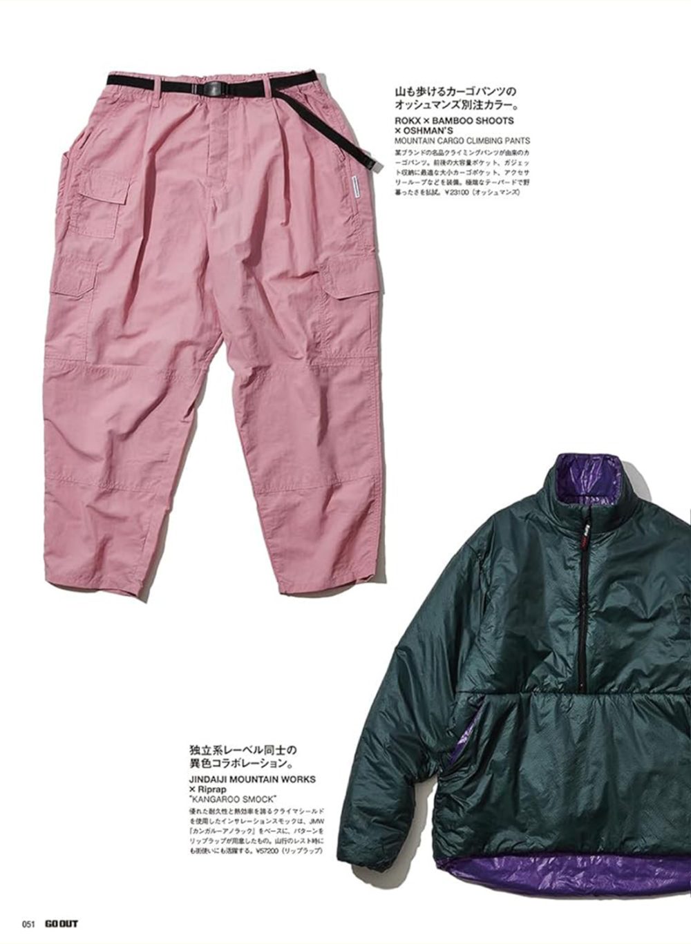 MEDIA メディア掲載情報 2025.10.03BAMBOO SHOOTS GOOUT 11月号(vol.193) GOOUTに商品を掲載いただきました。 特集「秋の、マストバイ。」にて、”MOUNTAIN CARGO CLIMBING PANTS”オッシュマンズ別注カラーが紹介されています。