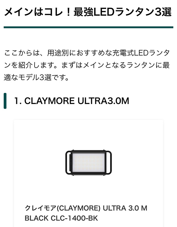 MEDIA メディア掲載情報 2025.11.04CLAYMORE ハピキャン キャンプ情報メディア「ハピキャン」に製品を掲載いただきました。 特集「最強の充電式LEDランタンはコレだ!おしゃれ&コスパ重視のおすすめも紹介」にて、”ULTRA 3.0″が紹介されています。 最強の充電式LEDランタンはコレだ!おしゃれ&コスパ重視のおすすめも紹介
