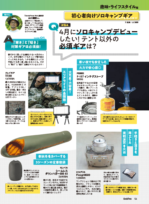 MEDIA メディア掲載情報 2026.03.06CLAYMORE GoodsPress 4月号 GoodsPressの4月号に製品を掲載いただきました。 特集「新生活ベストバイ」にて、新作エリアライトの”TITAN”が紹介されています。
